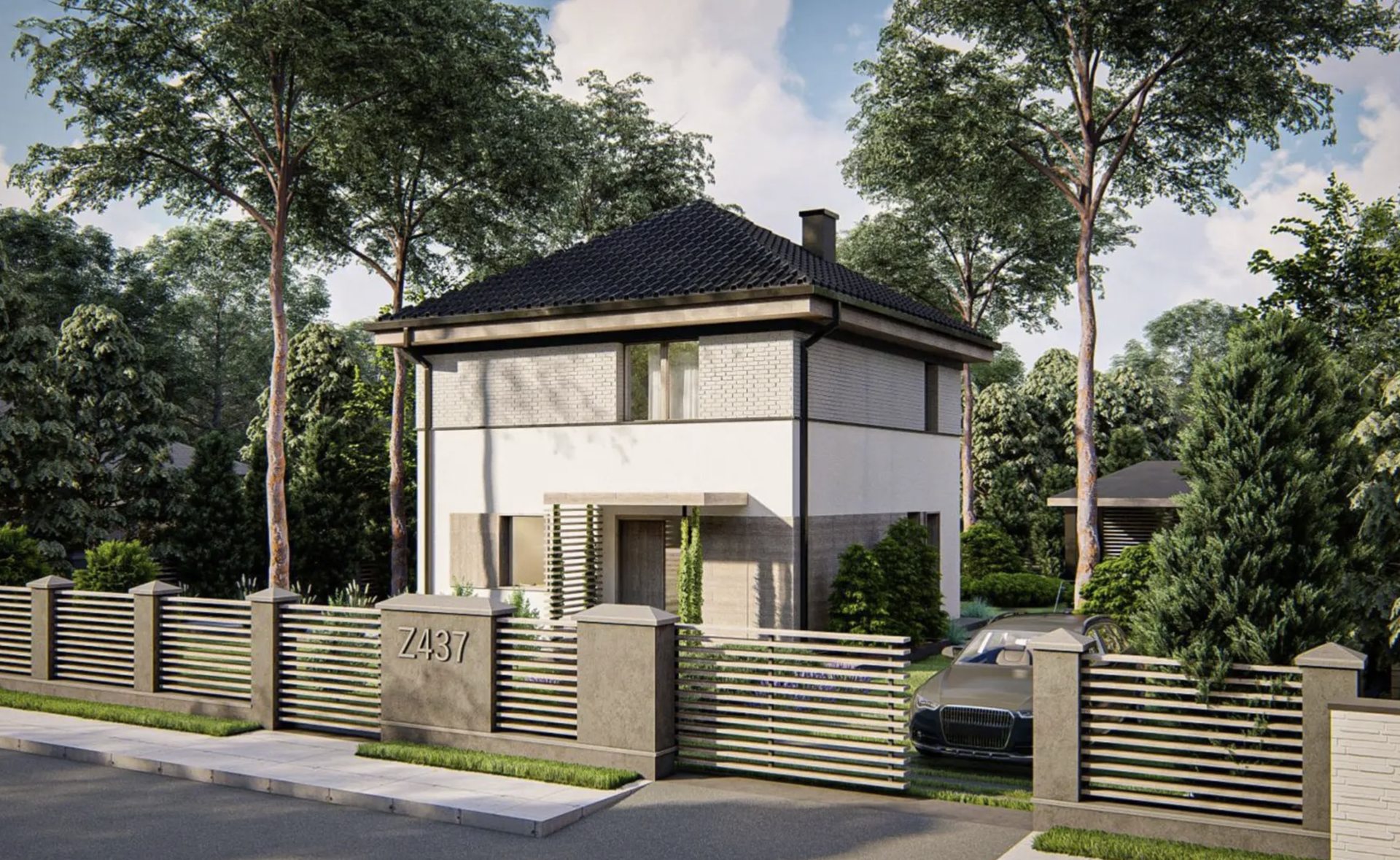 Удобный дом с современными элементами отделки фасадов. Подходит для узкого участка.