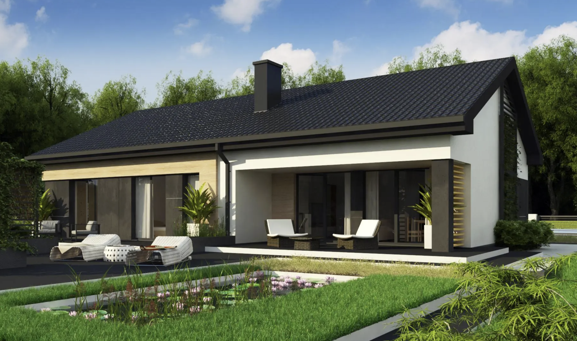 Одноэтажный дом с деревянной отделкой на фасадах