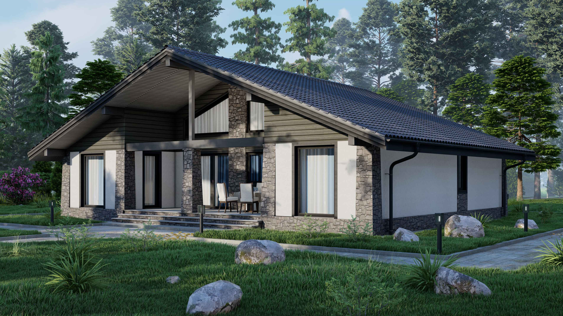 Одноэтажный дом с современными элементами отделки фасадов
