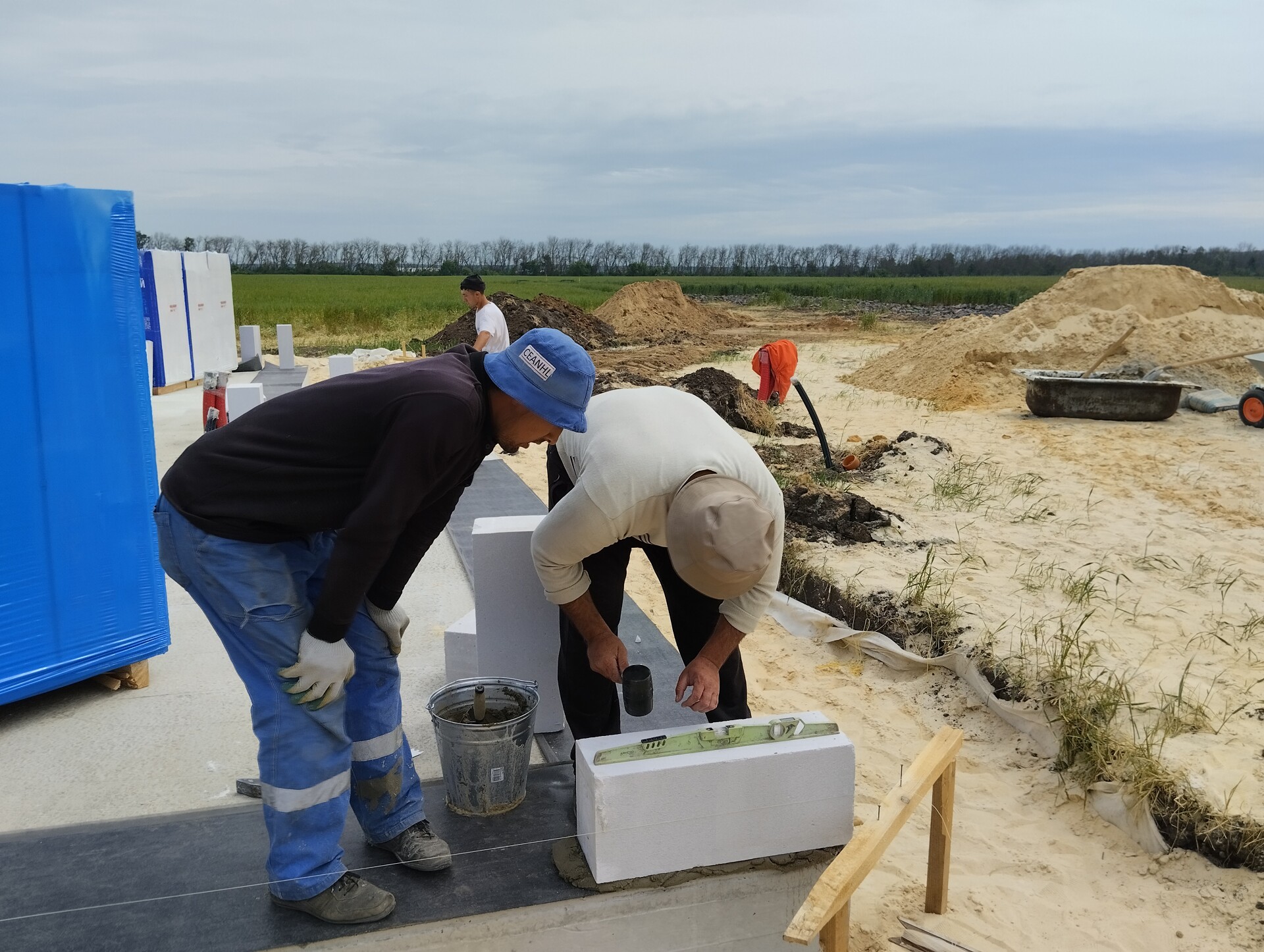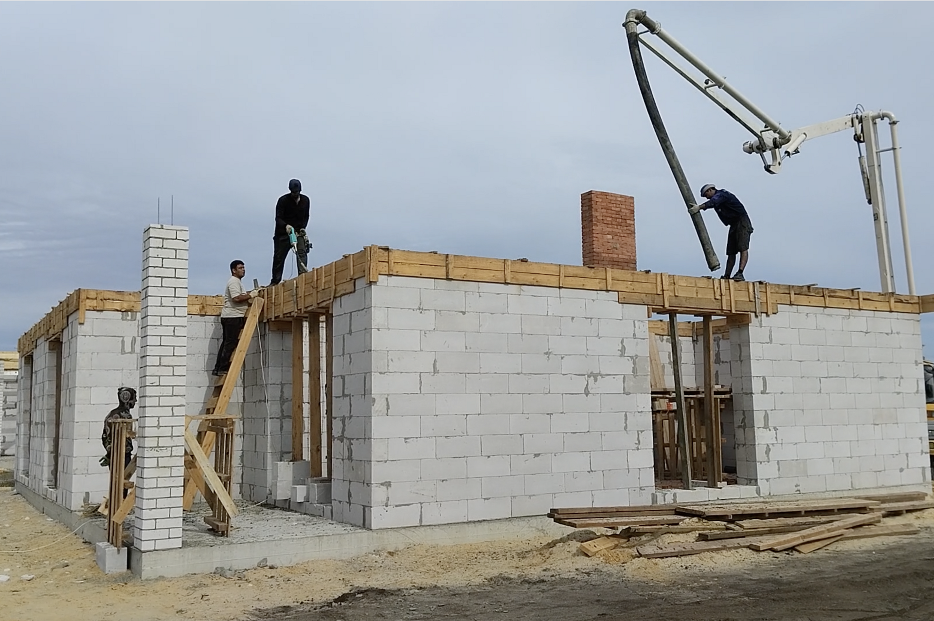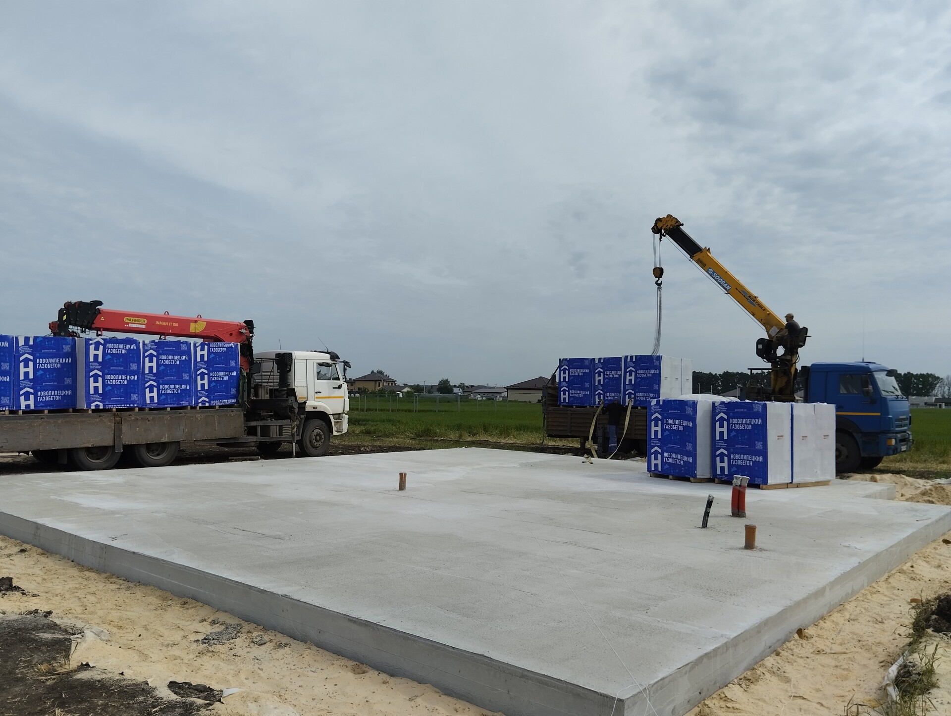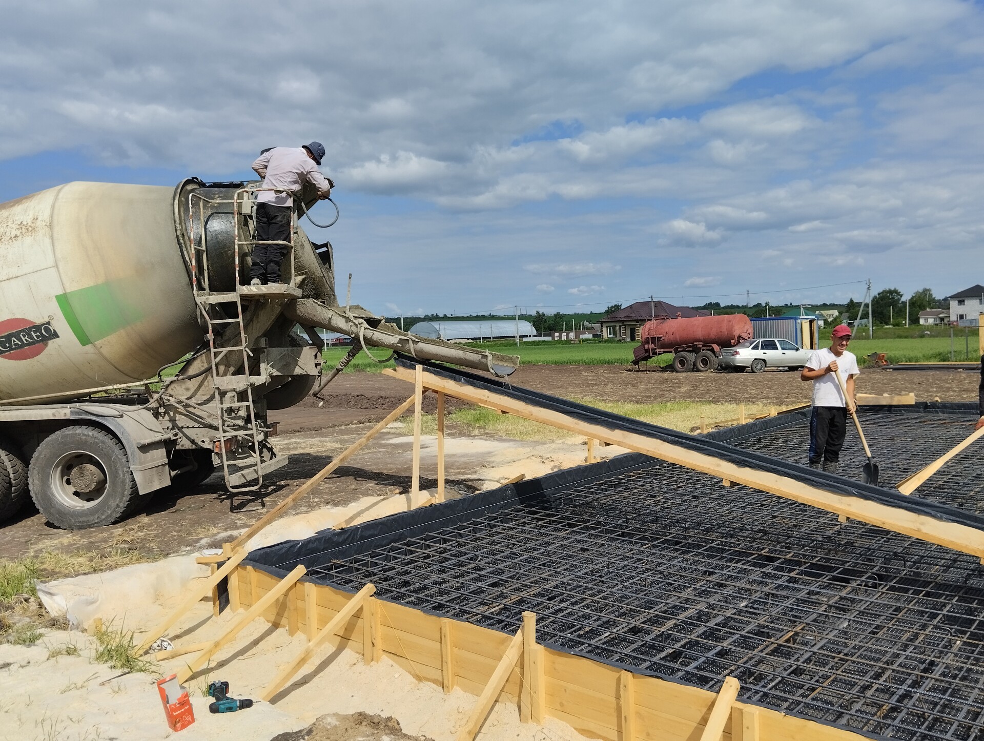 Подготовка участка, посадка здания, подушка, опалубка, арматурный каркас и заливка бетона - 1 месяц
